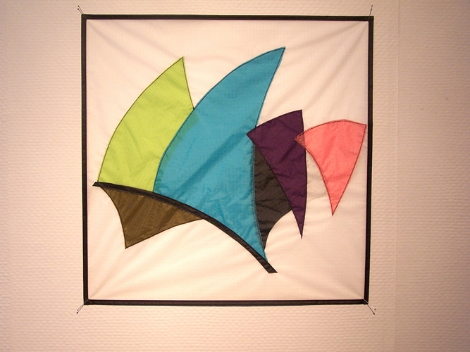 Uitgevoerd in stof "Spin-Art" Geinspireerd door o.a. Mondriaan en vakantie-impressiesHierbij diverse malen geexposeerd ook in combinatie met vliegers.